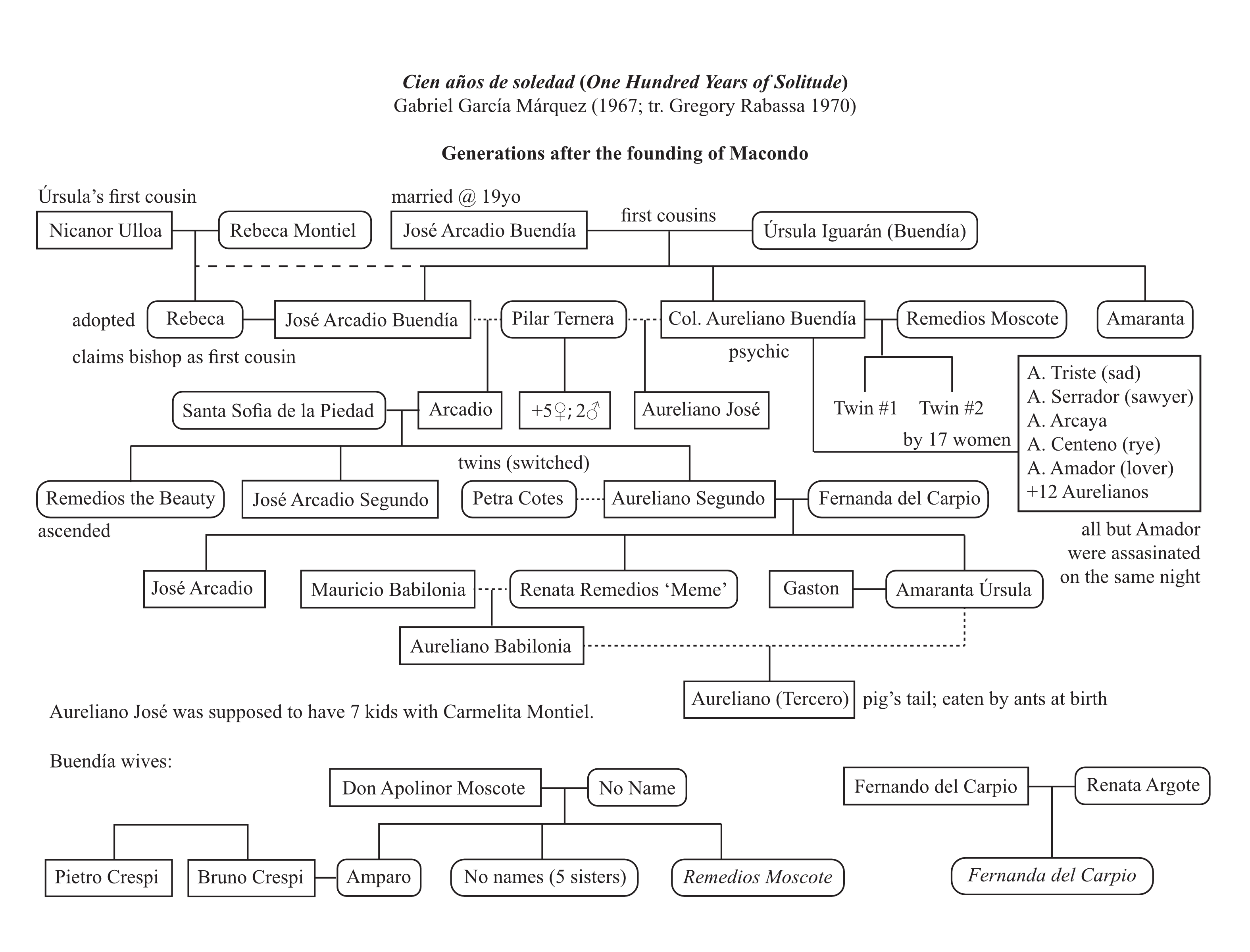 In addition to Aureliano José, and the twins with Remedios Moscote, Colonel Aureliano Buendía had 17 sons by 17 different women, for whom only a few of the names are given, as follows: A. Triste (i.e., tr. “Sad”), A. Serrador (“Sawyer”), A. Arcaya (from a surname of Basque origin), A. Centeno (“Rye”), and A. Amador (“Lover”). These name translations do not appear in the story; they are posed here simply because the author drops all sorts of other clues to soft mysteries, and the import might have been intended to be apparent in Spanish.