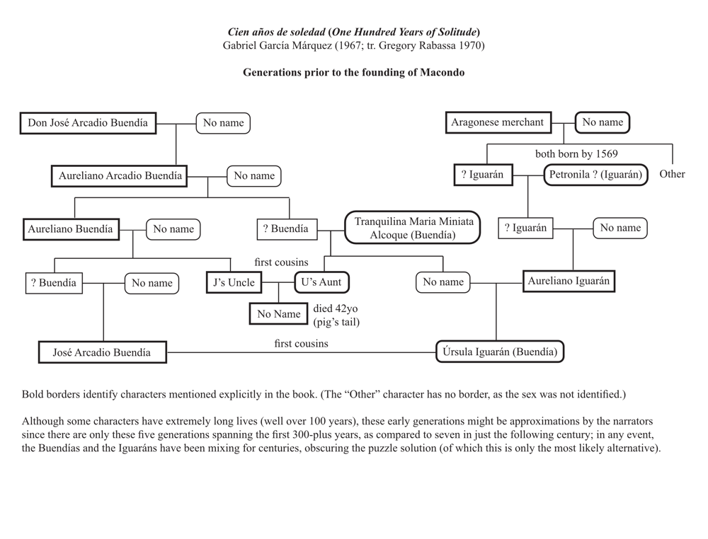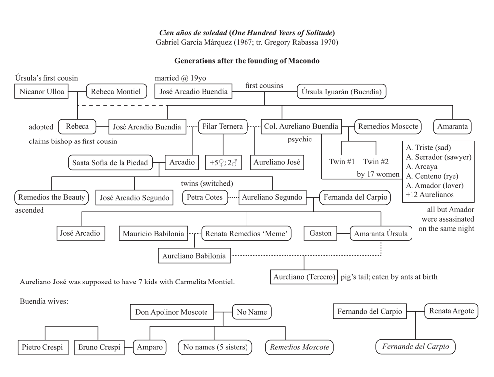 For various reasons, there exists no commercial, accessible version of Gabriel García Márquez’ 100 years of Solitude, either in English or the original Spanish (Cien años de soledad). While copyright restrictions allowed us to create an accessible version to accompany a purchased (inaccessible) volume, that ePub file cannot be distributed more generally (as that would compromise the hard copy sales); however, in the course of that project, we did extend the genealogical charts for the Buendía and Iguarán families. Beware: such charts contain spoilers.